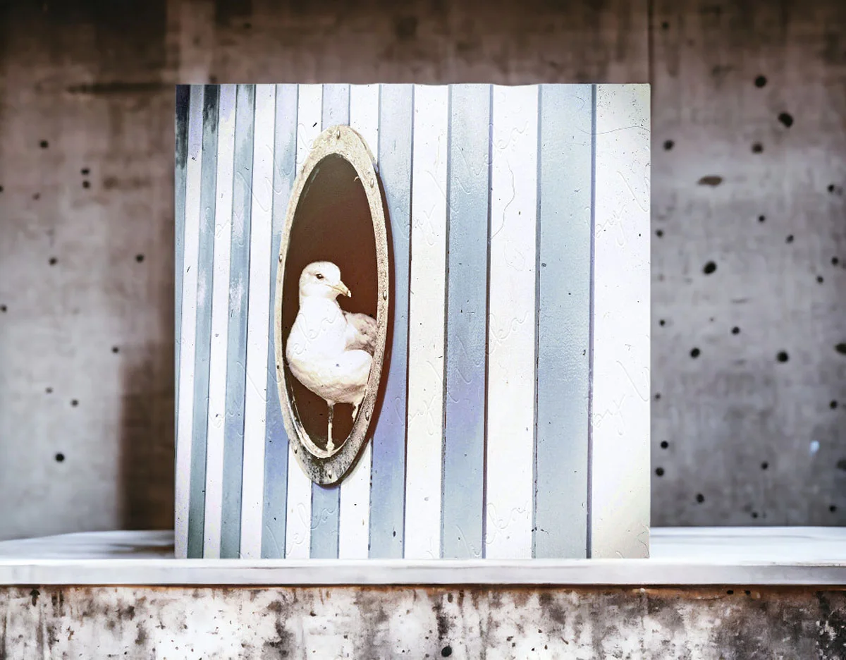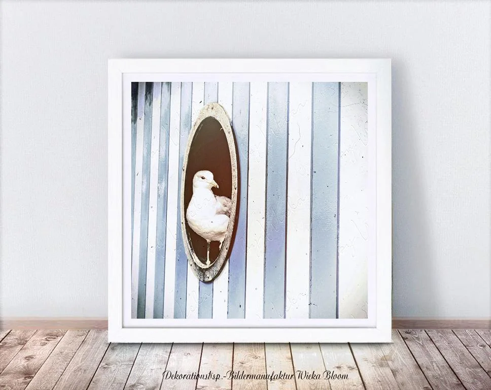 Rustikales Wandbild im Shabby Landhausstil. Du kannst das Motiv -Möwe im Bullauge - als Print auf Holz, Leinwand oder ungerahmt, als Kunstdruck auf FineArtPapier in verschiedenen Größen bestellen.