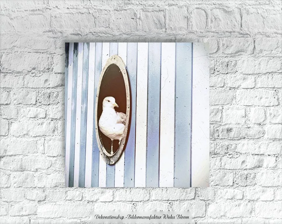 Möwe im Bullauge, maritimes Wandbild im Shabby Landhausstil