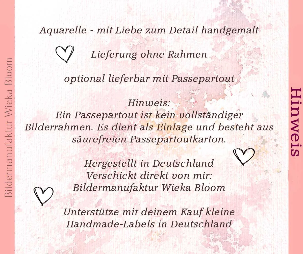Hochwertiger Kunstdruck in Miniaturformat, gefertigt nach einem von mir originalen, handgemalten Aquarellbild. Der Druck erfolgt auf edlem Büttenpapier, das durch seine natürliche Struktur und matte Oberfläche eine besondere Tiefe und Wertigkeit verleiht. Ideal als kleines Kunstwerk für deine Wandgalerie, als stilvoller Akzent im Regal oder als liebevolles Geschenk.