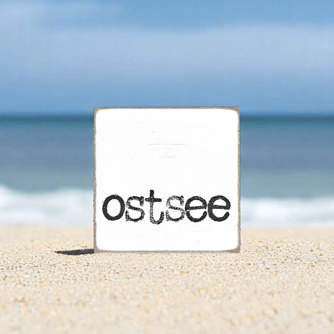 Maritimer Holzblock, Holzschild mit Spruch, Barfuß am Strand